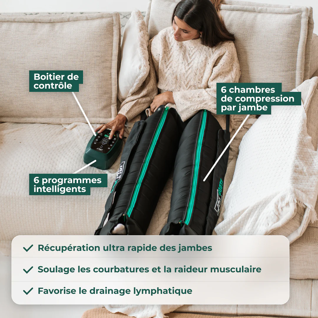 Le système de compression séquentielle intelligente agit en profondeur sur les muscles et les tissus pour améliorer le drainage lymphatique et limiter la rétention d’eau. Résultat : des jambes plus légères, une meilleure mobilité et des performances durables.