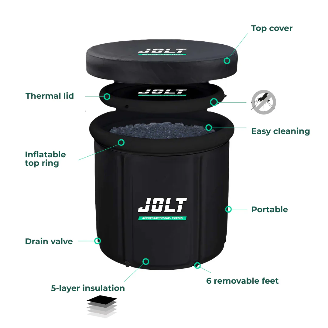 Jolt Ice Bath de Jolt est un bain froid portable à 5 couches d’isolation thermique, conçu pour optimiser la récupération après l’effort. Il aide à réduire les douleurs musculaires, stimuler la circulation et limiter les inflammations. Grâce à son format transportable, sa housse thermique incluse et sa grande capacité, ce bain froid Jolt s’intègre facilement dans toute routine de jolt cryothérapie.
